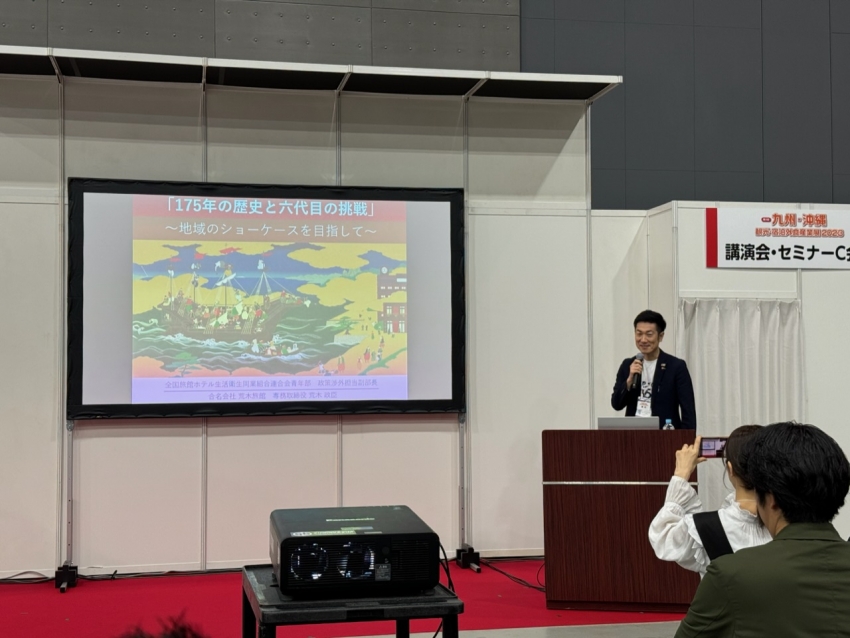 10月25日、マリンメッセ福岡で開催された、「九州・沖縄 観光・宿泊外食産業展2023」のセミナー会場にて、全旅連青年部の委員会によるセミナーを行った。