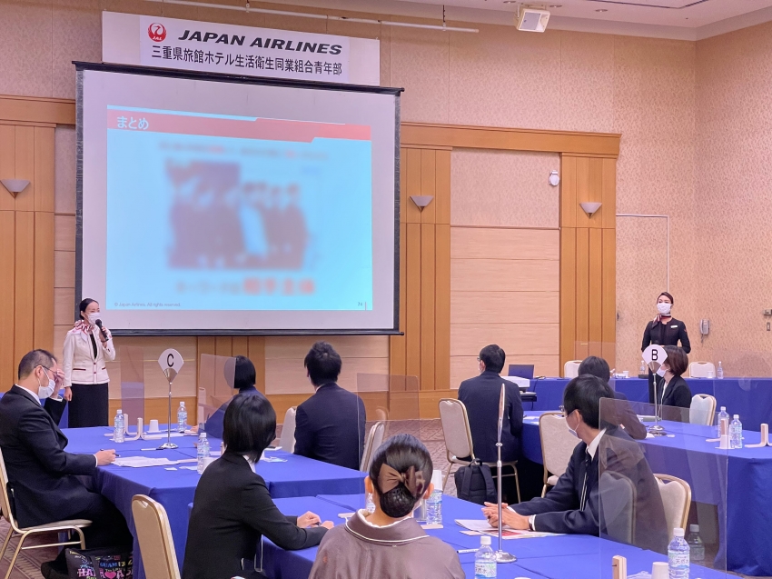 三重県旅館ホテル生活衛生同業組合青年部が県内の宿泊施設で接客業務に従事する従業員を対象とし、日本航空の先任客室乗務員とリードキャビンアテンダントの2名を講師に迎えJALマナーレッスンを開催した。24施設から40名を超える受講者が参加し、改めて接遇マナーを学ぶ機会となった。
